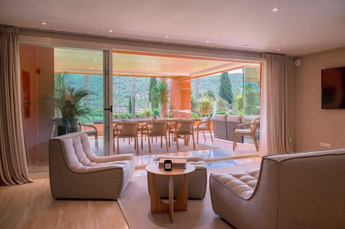 A Peaceful Oasis Between Golf, Nature, and the SeaNestled among the rolling, pine-covered hills of Ibiza’s east coast lies Roca Llisa—one of the island’s most prestigious and sought-after residential communities. This gated and secure enclave offers a serene atmosphere that invites instant relaxation. The stylish apartment now for sale is set in an exceptional location where peace, privacy, and comfort take center stage. Ideally situated between the lively Ibiza Town and the charming Santa Eulalia—both just 10 minutes away by car—you’ll enjoy the tranquility of nature without sacrificing access to beaches, restaurants, boutiques, or the island’s vibrant nightlife.A standout feature of this community is its direct access to Ibiza’s only golf course—an absolute dream for golf enthusiasts. At the same time, the surrounding nature offers endless opportunities for walking, cycling, or simply soaking in the views and the Mediterranean climate. Roca Llisa is designed to deliver the very best of the island: a harmonious blend of luxury living, natural beauty, and convenient accessibility. It’s the ideal choice for those seeking a safe, peaceful, and upscale environment where the true Ibiza spirit thrives.Smartly Designed, Stylishly Finished, and Full of SpaceThe apartment features a generous and well-thought-out layout with approximately 160 m² of interior living space (excluding terraces, winter garden, storage, and parking). With four bedrooms and four bathrooms, this home is perfect for families, hosting guests, or combining work and living. The master bedroom, about 15.5 m², is a peaceful retreat complete with a spacious 8.5 m² en-suite bathroom finished with high-quality materials. The other bedrooms—measuring approx. 14.5 m², 11.2 m², and a compact but functional 5 m² room (ideal as a child’s room, guest space, or staff quarters)—each come with their own bathroom, ensuring optimal privacy and convenience.At the heart of the home is a bright, open-plan living area that flows naturally between lounging, cooking, and dining. The 31.5 m² living room is connected to a spacious kitchen and seating area of approx. 55 m², fully equipped for modern living with plenty of space for a large dining table, a cozy lounge corner, and a contemporary kitchen layout with an island or bar—perfect for long dinners and entertaining.Practicality has also been carefully considered: a separate laundry room of around 8 m² offers ample space for washer, dryer, and storage. The apartment also includes a private garage box of approx. 10 m², an additional storage area, and a private parking space of approx. 12 m². Every detail in this home radiates comfort and quality—move-in ready.Sun, Greenery, and Outdoor Luxury—All Year RoundThrough the large sliding doors, the living space extends to a covered terrace of around 30 m²—an inviting winter garden perfect for long evenings or shaded summer lunches. Beyond that lies a 40 m² sun-drenched terrace with beautiful views of the green.